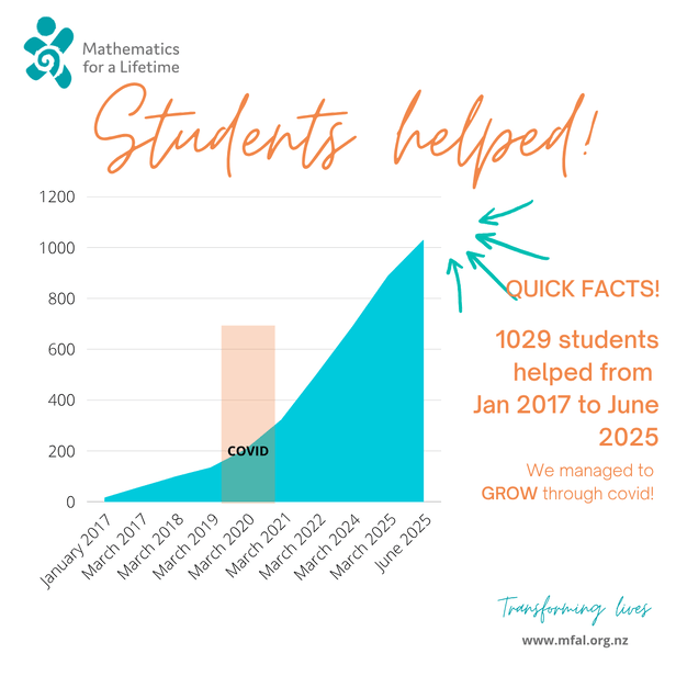 We've done a count! One thousand and twenty nine students have been helped since MFAL began! Do you struggle to decide which charities to support? Do you feel overwhelmed by the vast selection of organisations, unsure of which ones to trust with your hard-earned money? Introducing Mathematics for a Lifetime - the perfect solution to take the stress out of giving. Our Trust helps you base your giving on your values and interests, allowing you to easily track your help providing simple giving for one-time gifts or monthly giving. Make your giving efforts count with Mathematics for a Lifetime Charitable Trust. Invest in this cause and organisation for kiwi kids whose lives you care about most today! Come join our team of people making a difference in their communities.
