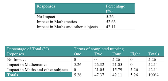 Majority of the students found that tutoring had a significant impact on their mathematics grades with 42% saying that other subjects had also improved. Many students directly mentioned that their science work had also improved as an impact of the mathematics tutoring. A parent commented that mathematics tutoring had “Raised her (the students) confidence levels in all other areas of her learning”.